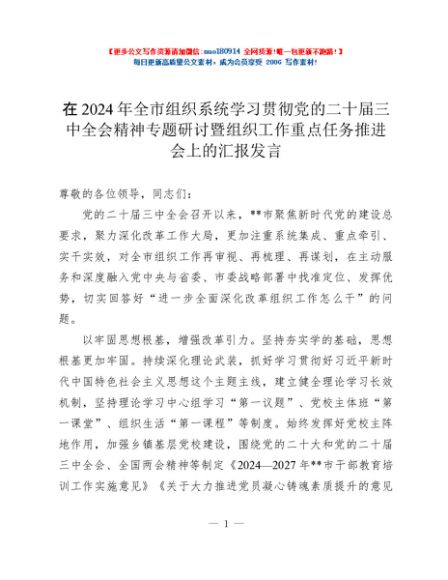 / 在2024年全市组织系统学习贯彻党的二十届三中全会精神专题研讨暨组织工作重点任务推进会上的汇报发言
