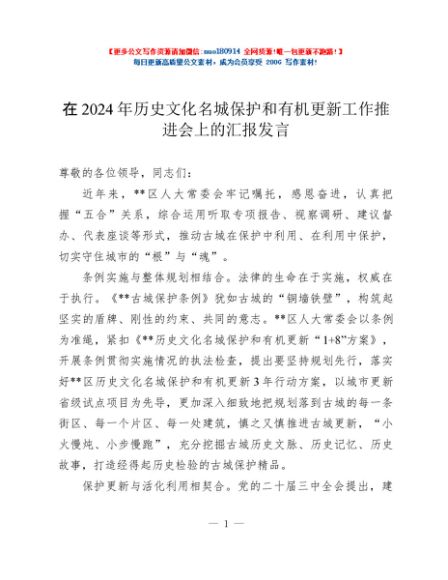 / 在2024年历史文化名城保护和有机更新工作推进会上的汇报发言
