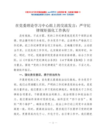 / 在党委理论学习中心组上的交流发言:严守纪律规矩 强化工作执行