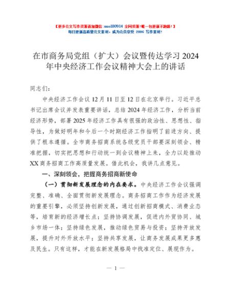 / 在市商务局党组(扩大)会议暨传达学习2024年中央经济工作会议精神大会上的讲话