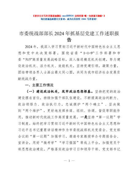 / 市委统战部部长2024年抓基层党建工作述职报告