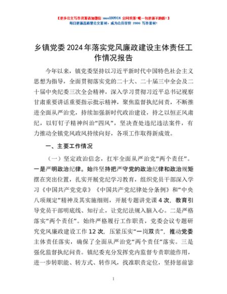 / 乡镇党委2024年落实党风廉政建设主体责任工作情况报告