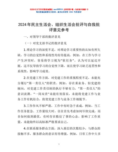 / 2024年民主生活会、组织生活会批评与自我批评意见参考