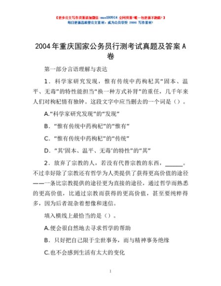 2004年重庆国家公务员行测考试真题及答案A卷