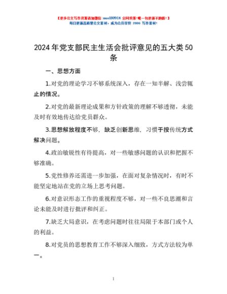 / 2024年党支部民主生活会批评意见的五大类50条