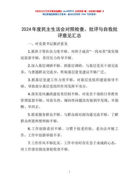 / 2024年度民主生活会对照检查、批评与自我批评意见汇总