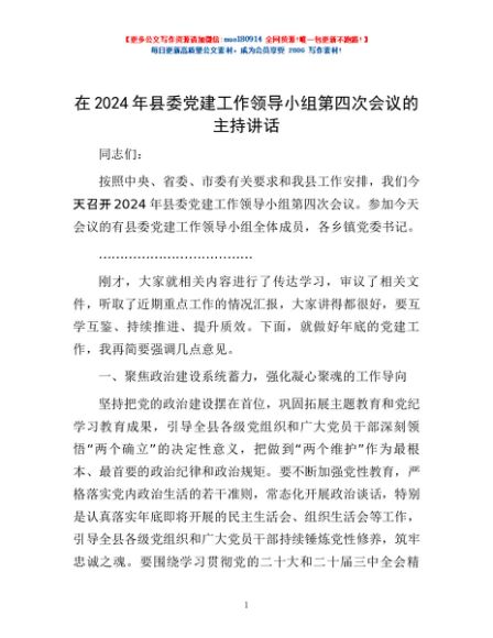 / 在2024年县委党建工作领导小组第四次会议的主持讲话
