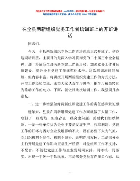 / 在全县两新组织党务工作者培训班上的开班讲话