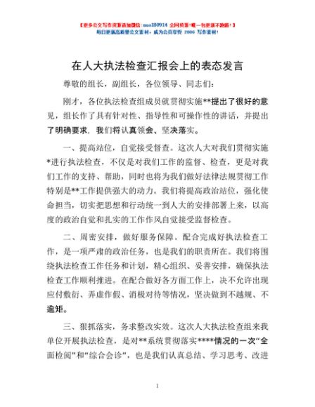 / 在人大执法检查汇报会上的表态发言