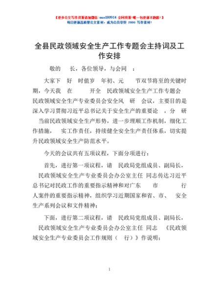 / 全县民政领域安全生产工作专题会主持词及工作安排