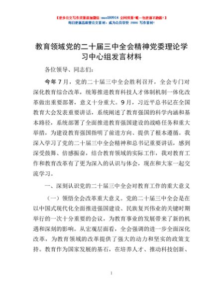 / 教育领域党的二十届三中全会精神党委理论学习中心组发言材料