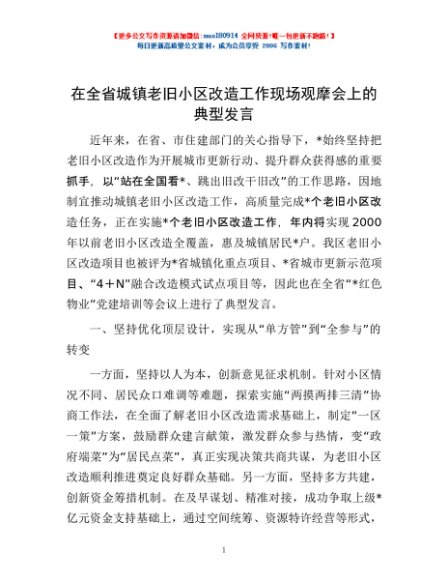 / 在全省城镇老旧小区改造工作现场观摩会上的典型发言