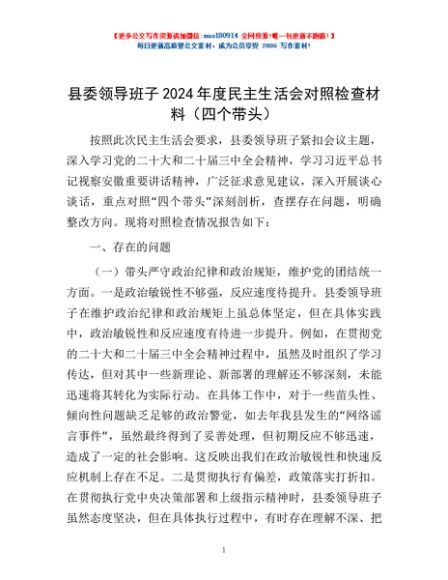 / 县委领导班子2024年度民主生活会对照检查材料(四个带头)