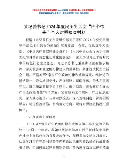 / 某纪委书记2024年度民主生活会“四个带头”个人对照检查材料