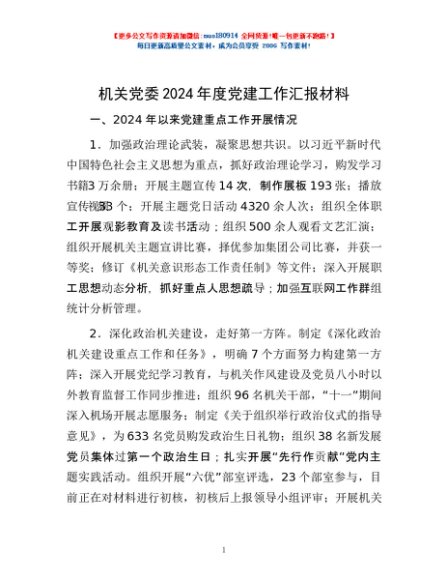 / 机关党委2024年度党建工作汇报材料
