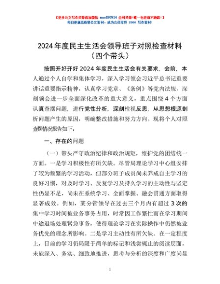 / 2024年度民主生活会领导班子对照检查材料(四个带头)