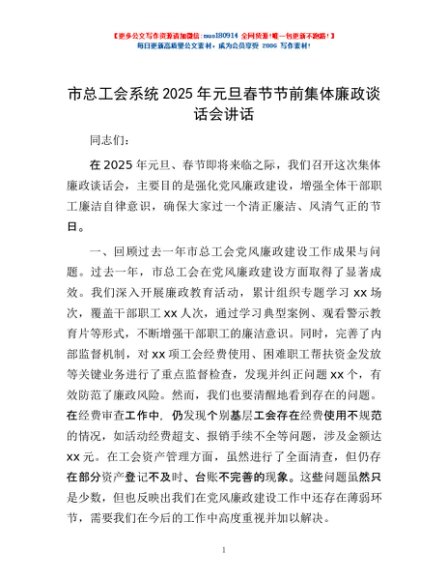 / 市总工会系统2025年元旦春节节前集体廉政谈话会讲话
