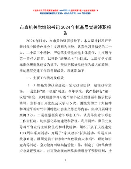 / 市直机关党组织书记2024年抓基层党建述职报告