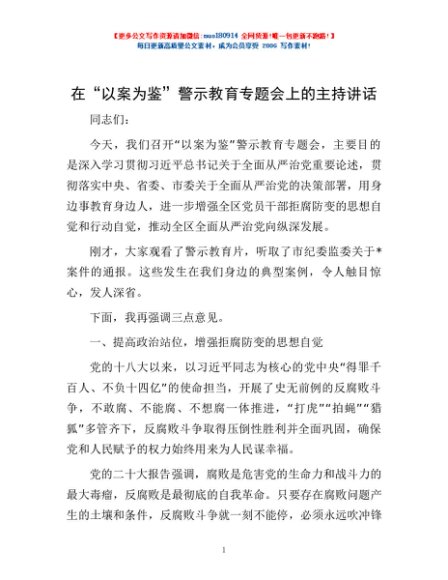 / 在“以案为鉴”警示教育专题会上的主持讲话