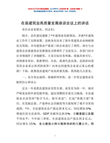 / 在县建筑业高质量发展座谈会议上的讲话