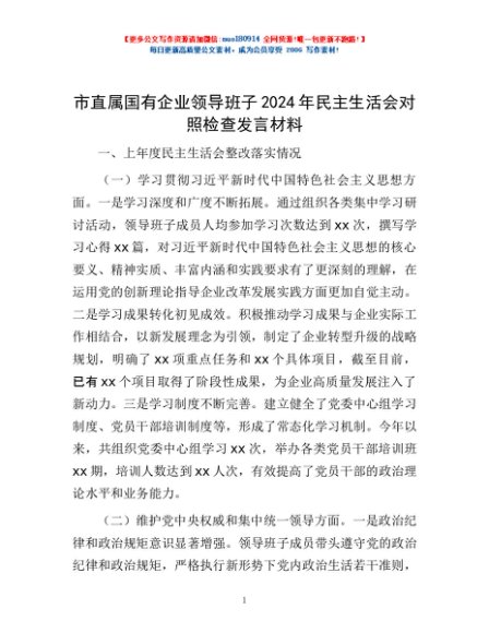 / 市直属国有企业领导班子2024年民主生活会对照检查发言材料