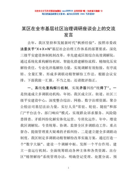 / 某区在全市基层社区治理调研座谈会上的交流发言