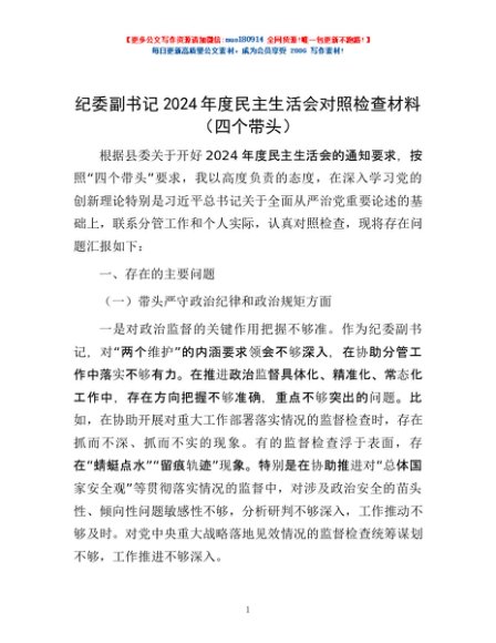 / 纪委副书记2024年度民主生活会对照检查材料(四个带头)