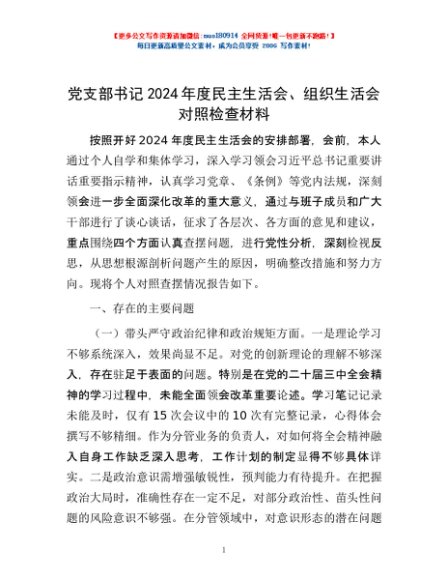 / 党支部书记2024年度民主生活会、组织生活会对照检查材料