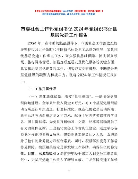 / 市委社会工作部党组书记2024年党组织书记抓基层党建工作报告