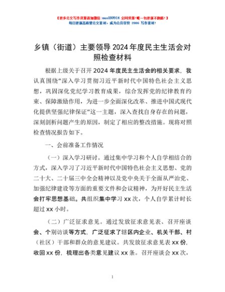 / 乡镇(街道)主要领导2024年度民主生活会对照检查材料