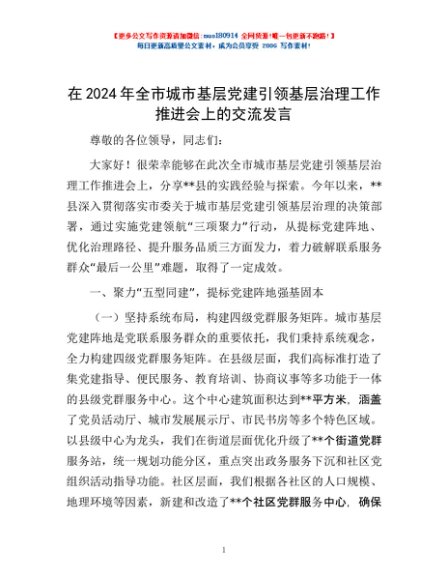 / 在2024年全市城市基层党建引领基层治理工作推进会上的交流发言