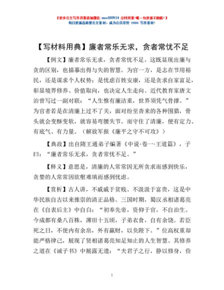 / 【写材料用典】廉者常乐无求,贪者常忧不足