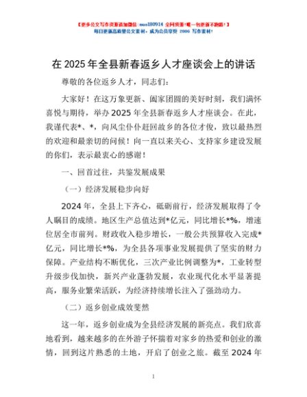 / 在2025年全县新春返乡人才座谈会上的讲话
