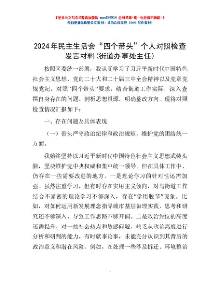 / 2024年民主生活会“四个带头”个人对照检查发言材料(街道办事处主任)