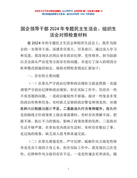 / 国企领导干部2024年专题民主生活会、组织生活会对照检查材料