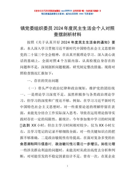 / 镇党委组织委员2024年度民主生活会个人对照查摆剖析材料