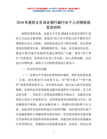 / 2024年度民主生活会银行副行长个人对照检视发言材料
