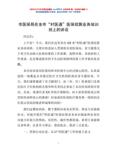 / 市医保局在全市“村医通”医保结算业务培训班上的讲话