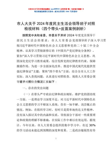 / 市人大关于2024年度民主生活会领导班子对照检视材料(四个带头+反面案例剖析)