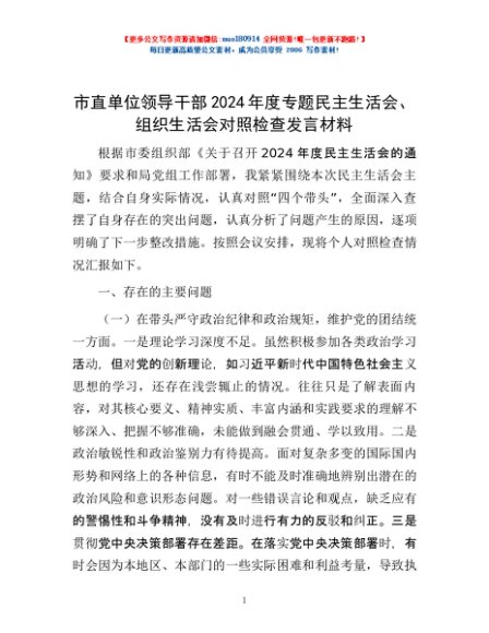 / 市直单位领导干部2024年度专题民主生活会、组织生活会对照检查发言材料