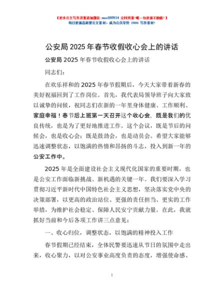 / 公安局2025年春节收假收心会上的讲话