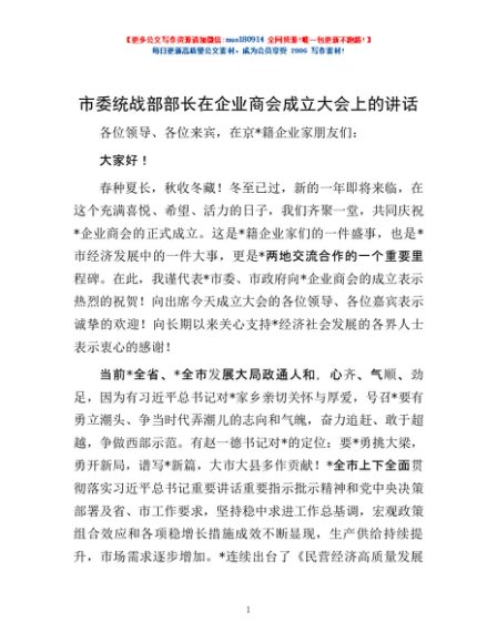 / 市委统战部部长在企业商会成立大会上的讲话