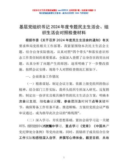 / 基层党组织书记2024年度专题民主生活会、组织生活会对照检查材料