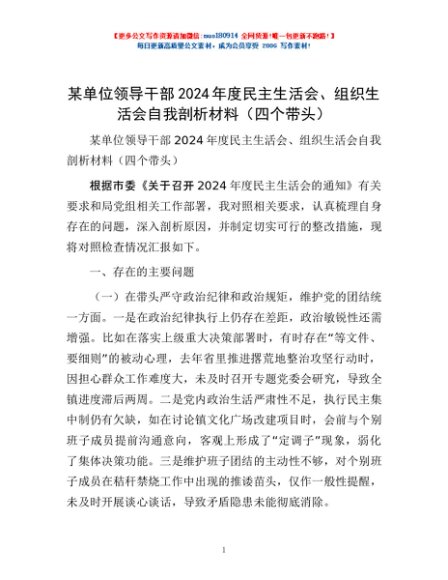 / 某单位领导干部2024年度民主生活会、组织生活会自我剖析材料(四个带头)