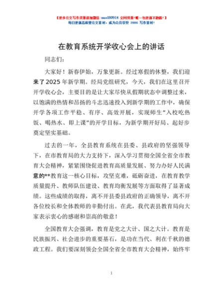 / 在教育系统开学收心会上的讲话