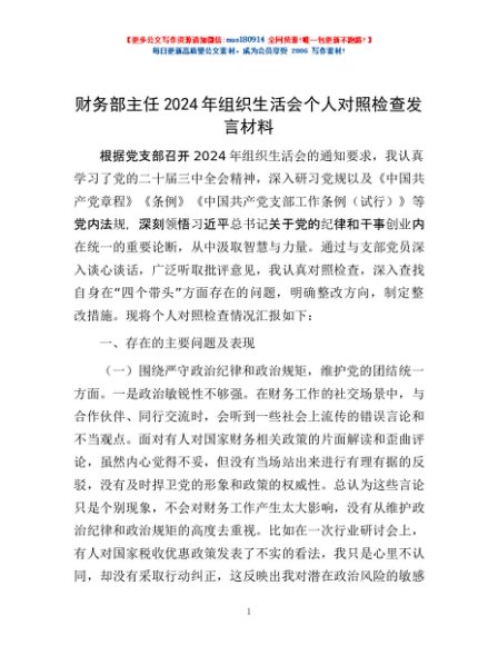 / 财务部主任2024年组织生活会个人对照检查发言材料