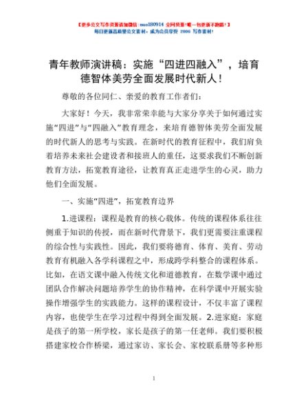 / 青年教师演讲稿:实施“四进四融入”,培育德智体美劳全面发展时代新人!