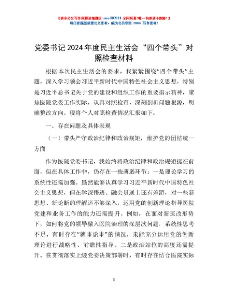 / 党委书记2024年度民主生活会“四个带头”对照检查材料