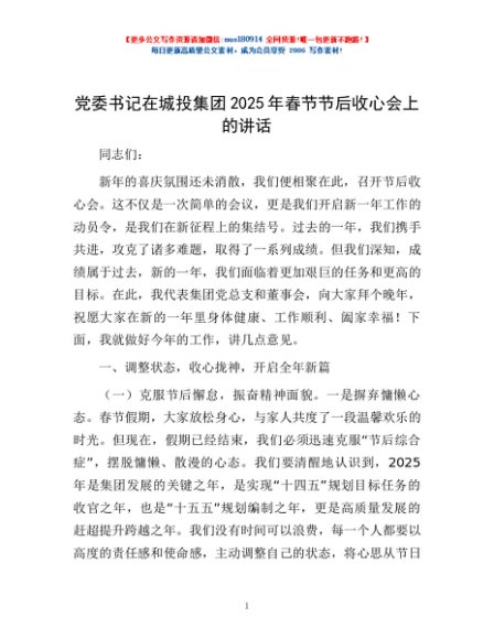 / 党委书记在城投集团2025年春节节后收心会上的讲话