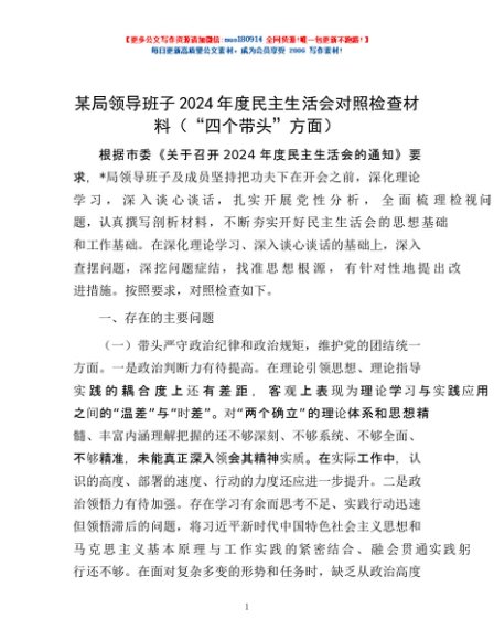 / 某局领导班子2024年度民主生活会对照检查材料(“四个带头”方面)